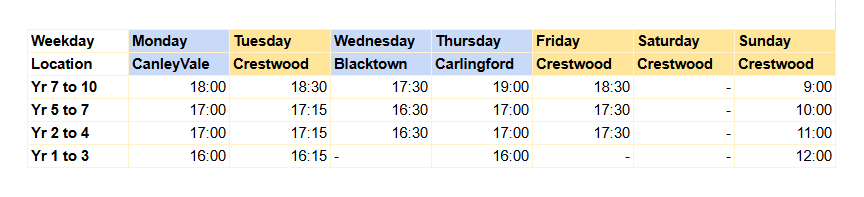 Available Class times for Term 1 2026